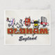 The landmarks and icons of Oldham, in Greater Manchester, England, featuring a stylised cartoon character versions of its exports and townscape, including (from left to right) a rag pudding holding up chips from the world's first chip shop, a Transport for Greater Manchester (TfGM) bus stop holding cotton spindle, a traditional red-brick terraced house, a Metrolink tram carrying test tube babies, and finally, the Civic Centre holding up a tubular bandage. Oldham is spelled out in traditional red brick and sandstone, with cotton flower embellishment.