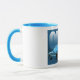 Colour rendering of a 3/4 rear view of a 1970 Oldsmobile Cutlass on blue panel one a white and blue coffee mug. A beautiful example of the muscle car era and a great gift for the gear head you may know.