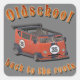 The design features a retro-style red old school van with the number "35" on the front and sides. The bus has a distinctive tuning design with a cut-off roof and a large rear spoiler, giving it a racing and hot rod look. Above it is written "Oldschool" in eye-catching vintage font, while underneath the sentence "back to the roots" underlines the nostalgic character of the design. The colour palette includes warm retro tones such as red, beige, orange and black.