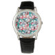 This men's watch has mid-century modern design of circles in blue, teal, pink, purple and berry with white ovals inside.