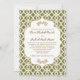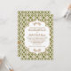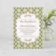 Elegant and beautiful french Moroccan tile inspired wedding invitations with a repeating olive green hue and gold geometric pattern design and gold hued floral flourishes. This upscale and luxe wedding invite is perfect for a Moroccan, Arabian Nights or Aladdin themed wedding. The back of these custom, fancy frame invitations and announcements can be personalised with the soon to be married bride and groom's monogram and names on the quatrefoil shape. Artwork and design © Chrissy H. Studios, LLC. All Rights Reserved.