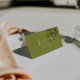 Classy and fancy wedding place card designed for a clean and elegant old money reception table setting. This folded escort card features a handwritten script wedding name paired with contemporary typography. The olive green wedding decor adds a fresh, stylish touch to your wedding. Perfect as a custom guest name card for a chic and simple wedding celebration. Use this elegant folded place card to elevate your modern reception table decor. A sophisticated contemporary wedding table card that complements any minimalist wedding theme.