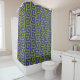 Olive green and blue abstract pattern shower curtain.