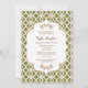 Elegant and beautiful french Moroccan inspired bridal shower invitations with a repeating olive green and gold geometric pattern design and gold hued floral flourishes. This upscale and luxe invite is perfect for any formal, exotic, Moroccan, Arabian Nights or Aladdin themed bridal shower. The back of these custom, fancy frame invitations and announcements can be personalised with the soon to be bride's monogram and event name on the quatrefoil shape and printed ribbon look design. Artwork and design © Chrissy H. Studios, LLC. All Rights Reserved.