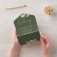 All in one olive green wedding invitation featuring botanical greenery rustic leaves falling across a gold arch enclosing elegant typography. The invitation includes a perforated RSVP card with your wedding website QR code. Designed by Thisisnotme©