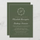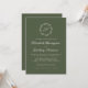 This elegant wedding invitation design features a white script monogram initial encircled by a line art botanical wreath on an olive green background. The names appear in white script, with the rest of the text in classic serif font. The back of the card is solid olive green.