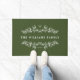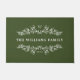 Olive green door mat with your name framed by mirrored half-wreaths of leaves and berries. Add your initial and the year your family was established in an elegant white font.