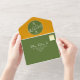 Simplistic, minimalist, modern, contemporary bold bright burnt orange and olive green all-in-one wedding invitation with QR code, monogram with hand drawn love couple birds, trendy handwritten script and custom picture of the at the back.