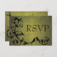 Send wedding guests this alluring RSVP card design featuring a grunge background with mocha leafy vines adorned with two lovebirds in olive green. Customisable text allows you to alter fonts, change text colours and sizes as you wish. Matching wedding stationery available with this design as well.