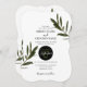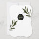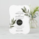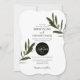 This design features olive leaves and branches. The beautiful greenery of the olive leaves compliment the elegant black modern circle shape encircling the wedding date. A perfect fusion of modern and chic with rustic olive colours. Olive green, black and white are a perfect match for a Mediterranean themed wedding. Unique wedding invitation design with modern elements. Matching wedding stationery items and other wedding invite formats are also available.