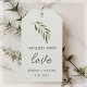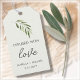 Customisable minimalist modern olive oil wedding favour tags. Featuring watercolor olive foliage on a light olive green background.