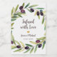 This bottle label for olive oil wedding favours has a frame of watercolor olives branches with green leaves and black olives. The message "Infused with Love" and the names are written in a handwriting script; the rest is written in caps. Above the names there is a small gold heart. The background is white.