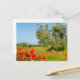 Postcard of an old olive tree in a poppy field full of vibrant red poppies in a landscape in Tuscany, Italy.