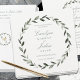 A minimalist olive leaf wreath with a classic wedding font for your names and details.