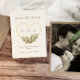 A romantic rustic wedding save the date announcement featuring your wedding date in a faux gold glitter geometric heart decorated with watercolor black olives and green leaves. Personalise with your details in green font and add your photo to the reverse.