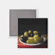 This magnet features a tantalising assortment of delicious olives including Picholine, Nicoise, Kalamata, Green Cerignola and Black Cerignola. They are arranged in a white dish on a colourful woven red, yellow and green mat against a black background for an artistic and mouth watering still life composition.