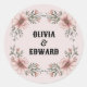 Celebrate your special day with this elegant custom wedding sticker featuring the names “Olivia & Edward.” Surrounded by a delicate floral border in soft pink and green hues, this round sticker is perfect for adding a personal touch to your wedding favours, invitations, or thank you notes. Crafted for memorable occasions, it’s an ideal keepsake for couples looking to add a bespoke element to their celebration.