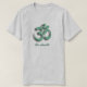 The Om symbol mystically embodies the essence and vibration of the universe. The phrase "Om shanti" is most often translated to mean, "May there be peace." Featured on this teein a pale turquoise shadow box design. Best on light colours!