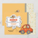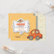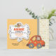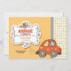 An adorable invitation showing a little girl driving a car and waving. A decorative panel with a brown bird holds the party's information.