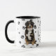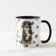 A beautiful Bernese Mountain Dog looks out at you from two sides of this mug. The text between the two images says "On the 8th day, God created the Bernese Mountain Dog and called it VERY GOOD". The dog images and the white oval banner containing the text fields are placed on a white background with black paw prints.