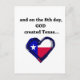 Great design for those who love the Lone Star State of Texas. Text reads "and on the 8th day, GOD created Texas" followed by a heart with the Texas flag superimposed on it. Special requests? Comments or suggestions? I'm just a message away!