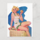 Vintage pin-up picture from a classic age. A fun, sassy picture of a retro pinup pose. Girl sitting on top of an apple cart eating an apple.
