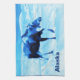 A monochrome (blue) image of a cow moose walking in snow. Text reading "Alaska" also appears. Moose are year-round residents in many northern communities. Here in Anchorage there are about 1500 animals, along with wolves, brown bears and other wildlife.They are usually well-behaved. They often cross streets at the crosswalks after waiting for a walk signal.