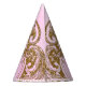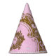Princess birthday party hats with pretty pink and gold once upon a time stylised text on a pretty pink and gold background.