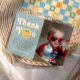 This groovy boys 1st birthday thank you card captures retro 70s vibes with a cute blue smile theme, and a pastel blue chequered pattern on the back. Fully customisable, it includes space for your message, a photo and name. Perfect for a "One Cool Dude" boho birthday.