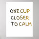A simple, illustrative text-based design featuring the motivational quote "ONE CUP CLOSER TO CALM." The hand-drawn style typography uses a subtle black to golden-brown gradient against a light gray background, making it perfect for a minimal aesthetic on a sweatshirt, t-shirt, mug, or as a cozy, inspiring graphic for coffee and tea lovers.