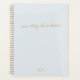 An elegant planner with handwritten script informal casual typography in gold "one day at a time" with personalised monogram in gold on a powder blue background. The perfect planner to organise your life!
