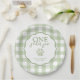 Celebrate her One Golden Year in sweet puppy style with this round paper plate. A green gingham border surrounds a scalloped centre that features a gingham paw print and editable text for your girl's name and first birthday date. Perfect for cake slices, snacks, and photo ready table settings at any golden retriever themed party.