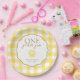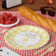 Celebrate her One Golden Year in sweet puppy style with this round paper plate. A yellow gingham border surrounds a scalloped centre that features a gingham paw print and editable text for your girl's name and first birthday date. Perfect for cake slices, snacks, and photo ready table settings at any golden retriever themed party.