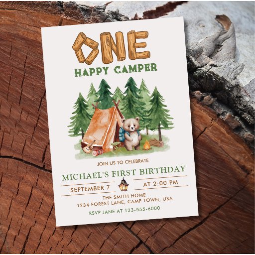 One Happy Camper Woodland Watercolor 1st Birthday Invitation
