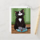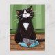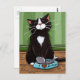 Cute cat themed postcard featuring a painting by Lisa Marie Robinson. This black and white tuxedo cat has the biggest smile on his face. Just look at the size of his fish supper! Cat sits on a wood floor in front of a green wall with an I Love Fish bowl. Copyright © Lisa Marie Robinson. All Rights Reserved. It is illegal to use or duplicate this, or any of our images, without written permission.