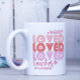 One Love Teacher Pink Modern Personalised Name Coffee Mug features the text "one loved teacher" in modern pink script typography accented with love hearts and personalised with your custom name. Perfect for your favourite teacher for teacher appreciation, birthday, Christmas, holidays and more. Designed by Evco Studio www.zazzle.com/store/evcostudio