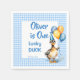 One lucky duck blue gingham 1st birthday party printed napkins template , cute mallard duck with a party hat and balloons with soft pastel blue gingham border for boys 1st birthday party personalised tableware table decor printed napkins