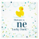 "One Lucky Duck" first birthday party theme featuring rubber duck surrounded by confetti, bubbles and blue text.