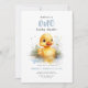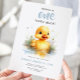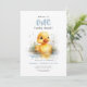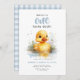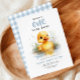 "One lucky duck" first birthday invitation with a cute duckling and a cottagecore gingham pattern background.