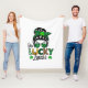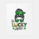 This is a fun fleece blanket to celebrate St. Patrick's Day with a design featuring a woman with her hair in a bun wearing sunglasses and the words "One Lucky Lassie".