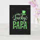 This card features the phrase “one Lucky PAPA” centered on a deep black background, with lime-green lettering that glows against the dark. “one Lucky” sits above in a flowing, cursive-style line, giving the words a gentle, affectionate feel, like a soft note meant just for him 💚. A small leprechaun hat rests above the word “one,” tipped slightly as if it’s winking at the reader, complete with a simple buckle. “PAPA” is placed beneath in large capital letters, heavier and steadier, like a strong base under the lighter line above. Little four-leaf clovers are tucked into the openings of the A’s, adding a quiet nod to luck and a sweet, family-forward touch ☘️. The high contrast between the black field and the green text keeps everything crisp and easy to read, with the message staying right in the middle of the design. In the background, a faint grid and soft clover outlines drift across the black, adding depth without pulling attention from the central text and hat.