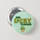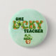 This One Lucky Teacher button is on a green watercolor background and has a green and orange polka dot pattern for the letters in Lucky. There is a shamrock for the "U" and a pot of shamrocks as well.