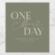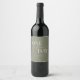 Minimalist wedding rehearsal dinner wine bottle label featuring typography text that says "one more day." The background is sage green.