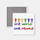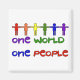 Rainbow figures link arms and stand on the words: "One World One People" to get the message out that world peace starts with us. We must get along with each other before we can have peace.