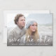Chic and elegant save the date magnet features your photograph with a white script save the date overlay. It is designed to complement any picture. The white will show up even against white or cream as you can see in the sample photo. Your wedding date, location and names follow in a classic serif white text.