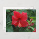 Photograph of single open delicate red hibiscus flower, buds, and green leaves on a Caribbean rain forest path. Daydream about a tropical paradise!