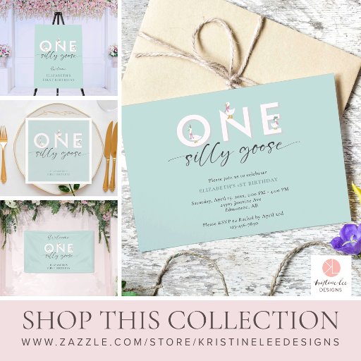 Cute first birthday invitation, featuring "One Silly Goose" theme with cute illustration.