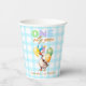 Cute one silly goose 1st birthday theme, boy birthday party paper cups featuring a cute watercolor baby goose with a party hat and balloons on a soft blue gingham plaid background.