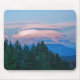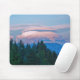 The setting sun casts colours across the land, and highlights the clouds surrounding Mount Rainier.