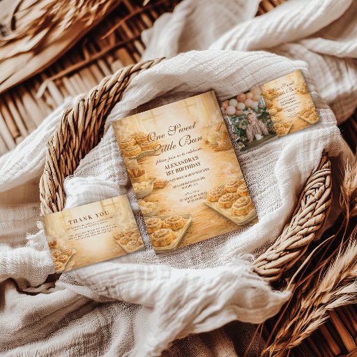 Celebrate a very special first year with this warm and cozy One Sweet Little Bun birthday design. Inspired by fresh-baked cinnamon rolls, soft morning light, and the sweetest bakery moments, this invitation sets the tone for an intimate and joyful first birthday celebration.